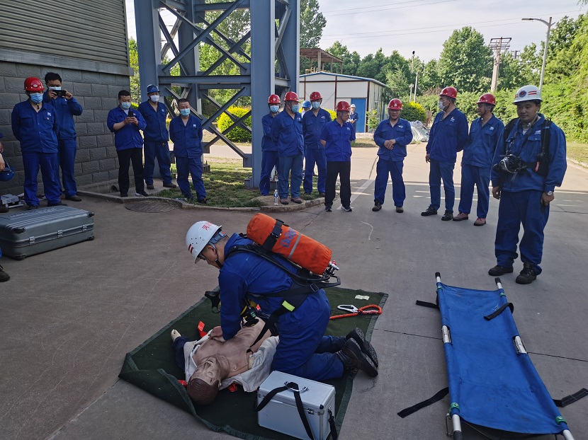 本次演練在公司安全總監(jiān)侯國棟的一聲令下,演練拉開序幕,由公司應(yīng)急救援隊組成的現(xiàn)場作業(yè)組、應(yīng)急救援組、疏導(dǎo)警戒組、醫(yī)療救護(hù)組等4組演練人員開展救援工作,相繼展示了事故發(fā)生后的事故報告、現(xiàn)場秩序維護(hù)、氣體檢測、救援三腳架搭設(shè)、安全防護(hù)裝備佩戴、通風(fēng)設(shè)備使用、人員救護(hù)等應(yīng)急處置全過程。